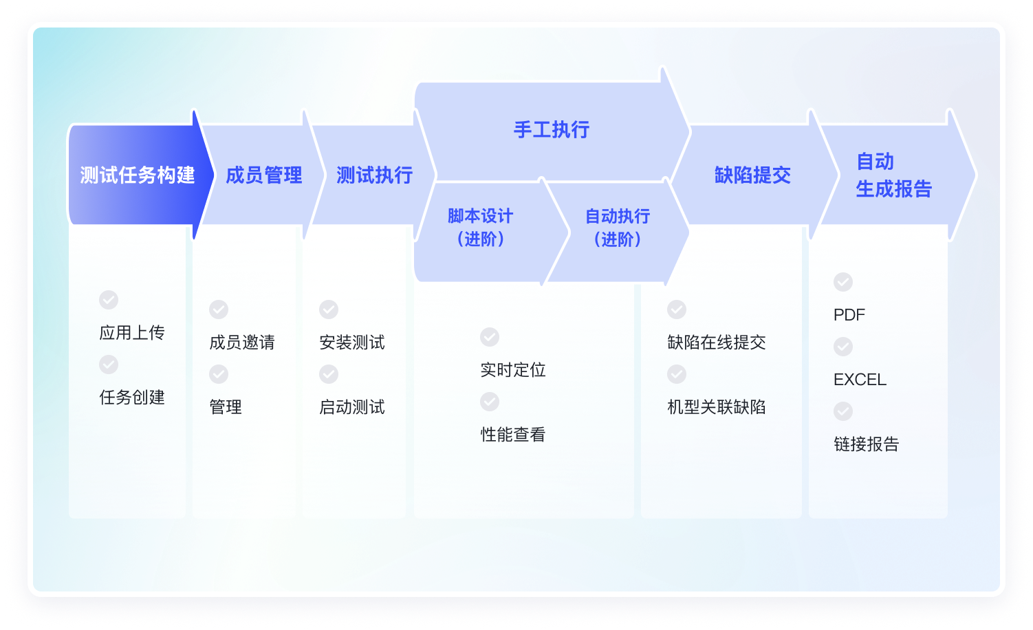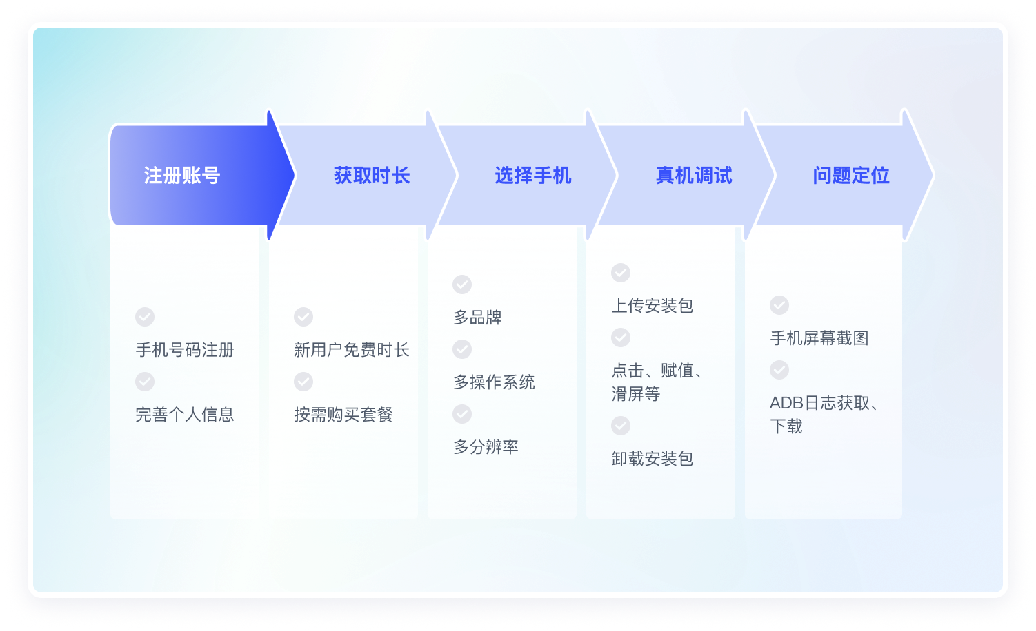 【自动化测试】是指针对非人工参与的测试场景通过平台进行自动化脚本设计后,在不同手机调试时进行自动化脚本执行,验证自动化脚本流程在不同品牌、系统版本、分辨率上的兼容性。