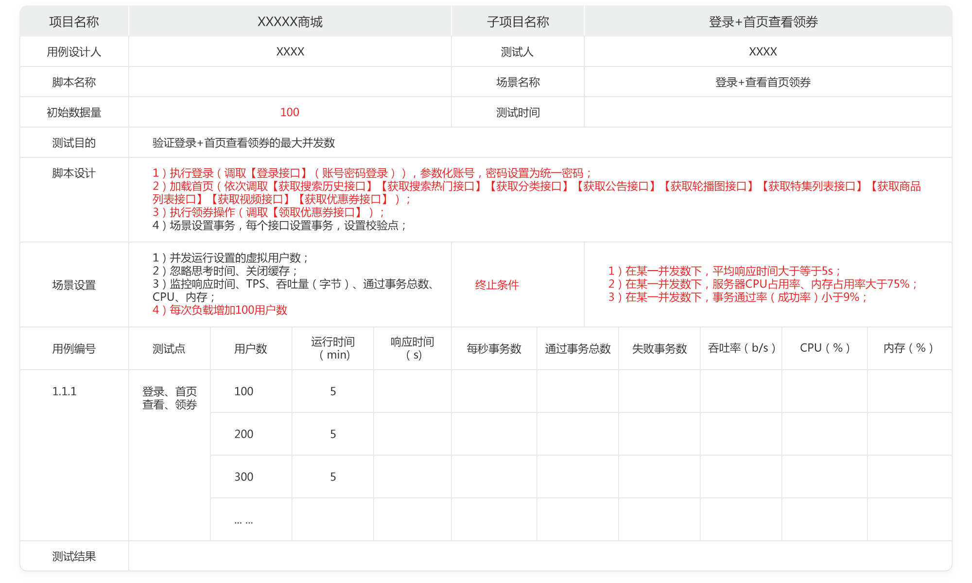 1)成功事务数99% | 1)测试脚本 | 1轮 | 确认脚本是否与用例设计、实际场景一致 |